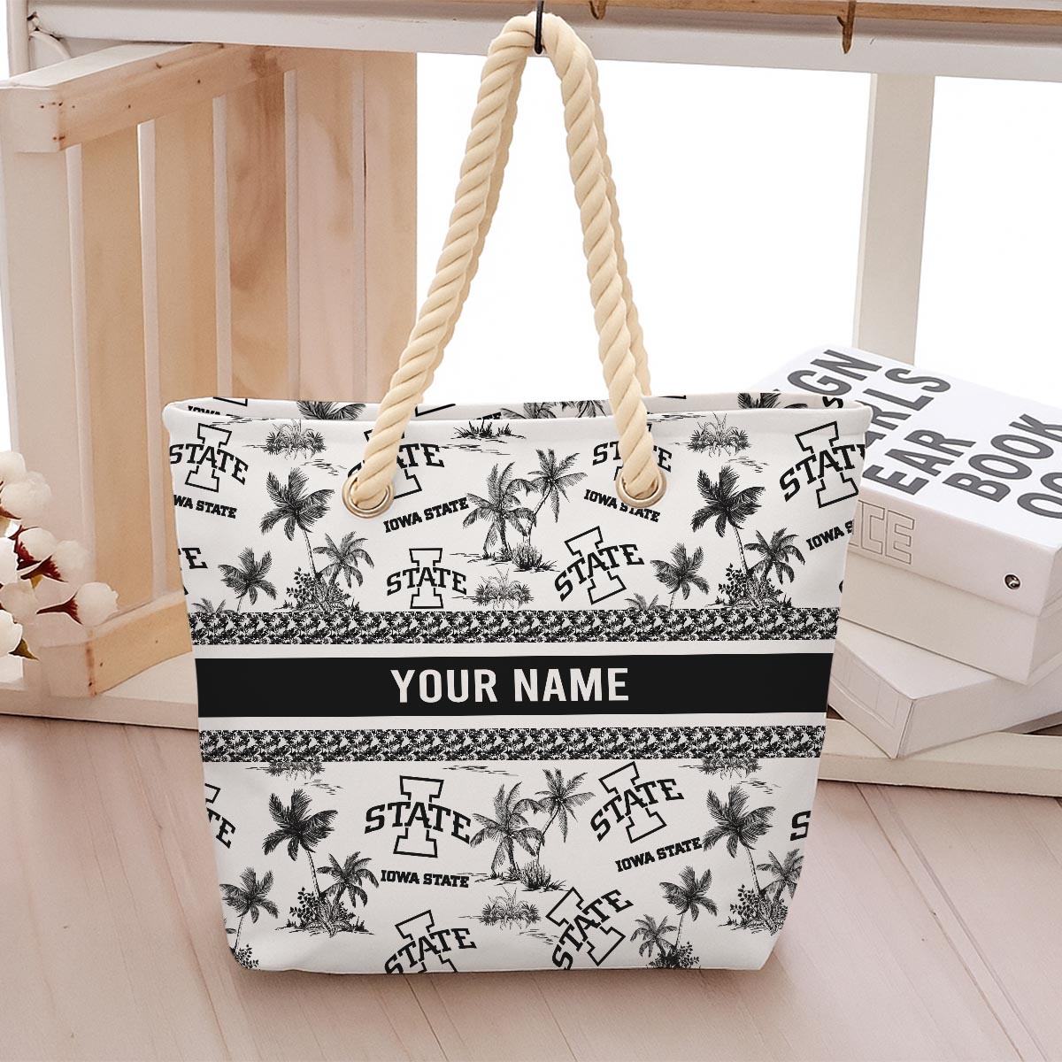 Crafted from durable, lightweight fabric, it features a vibrant red and white design with tropical palm patterns and the iconic Bearcats logo. The sturdy rope handles add a chic, nautical touch while ensuring comfortable carrying. Personalize it with your name for a unique and stylish look that’s all yours!