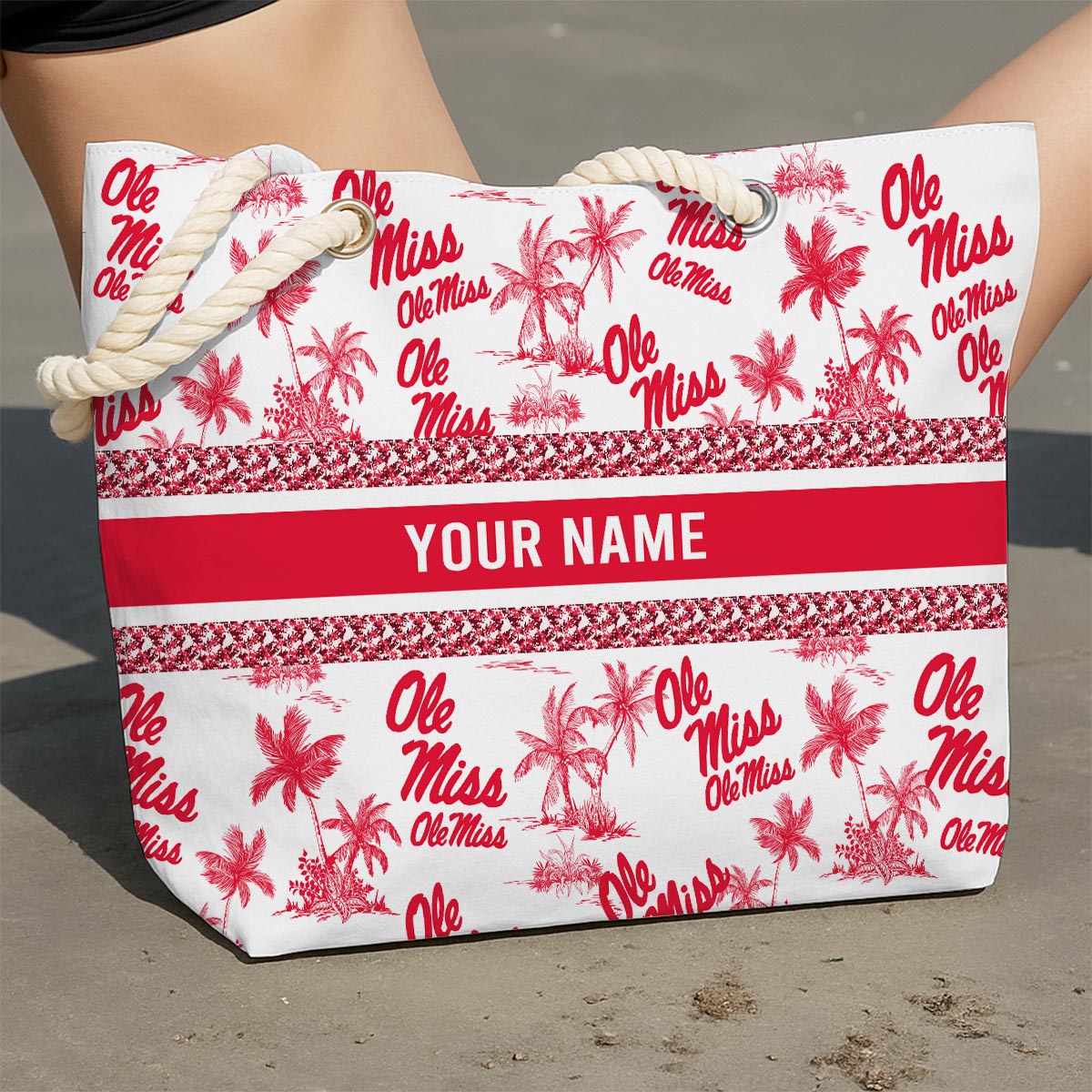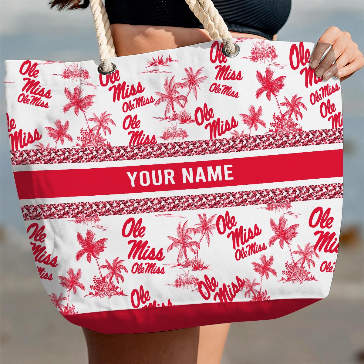 Crafted from durable, lightweight fabric, it features a vibrant red and white design with tropical palm patterns and the iconic Bearcats logo. The sturdy rope handles add a chic, nautical touch while ensuring comfortable carrying. Personalize it with your name for a unique and stylish look that’s all yours!